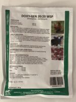 Doxy-Gen 20/20 wsp is a combination preparation containing gentamycin and doxycycline and provides a broad antibacterial spectrum covering the most microbial agents producing diseases in animals. Gentamycin belongs to the group of amino-glycoside antibiotics and has bactericidal action. It has a broad antibacterial spectrum and is active against Gram-positive and Gram-negative bacteria (including: Pseudomonas spp., Klebsiella spp., Enterobacter spp., Serratia spp., E. coli, Proteus spp., Salmonella spp., staphylococci). Moreover, it is active against Campylobacter fetus subsp. jejuni and Treponema hyodysenteriae.
